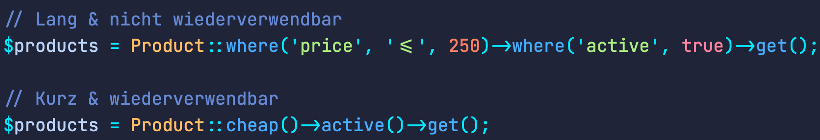 Ziel dieses Beispiels ist es, alle aktiven Produkte aus der Datenbank abzurufen, deren Preis 250 oder weniger beträgt. Eine herkömmliche where-Abfrage ruft dabei die Produkte ab. Was grundsätzlich gut funktioniert, kann allerdings schnell unübersichtlich werden, sobald dieselbe Abfrage in mehreren Dateien durchgeführt wird. Möchten man zu einem späteren Zeitpunkt den Preis ändern, muss dies manuell in jeder Datei abgeändert werden. Etwas einfacher kann diese Abfrage mithilfe von Scopes gestaltet werden. Um die where-Abfrage an einer zentralen Stelle bearbeiten zu können, müssen die Scopes in dem Products Model hinzugefügt werden. Dabei ist zu beachten, dass die Namen der Scope-Funktionen immer mit „scope“ beginnen.